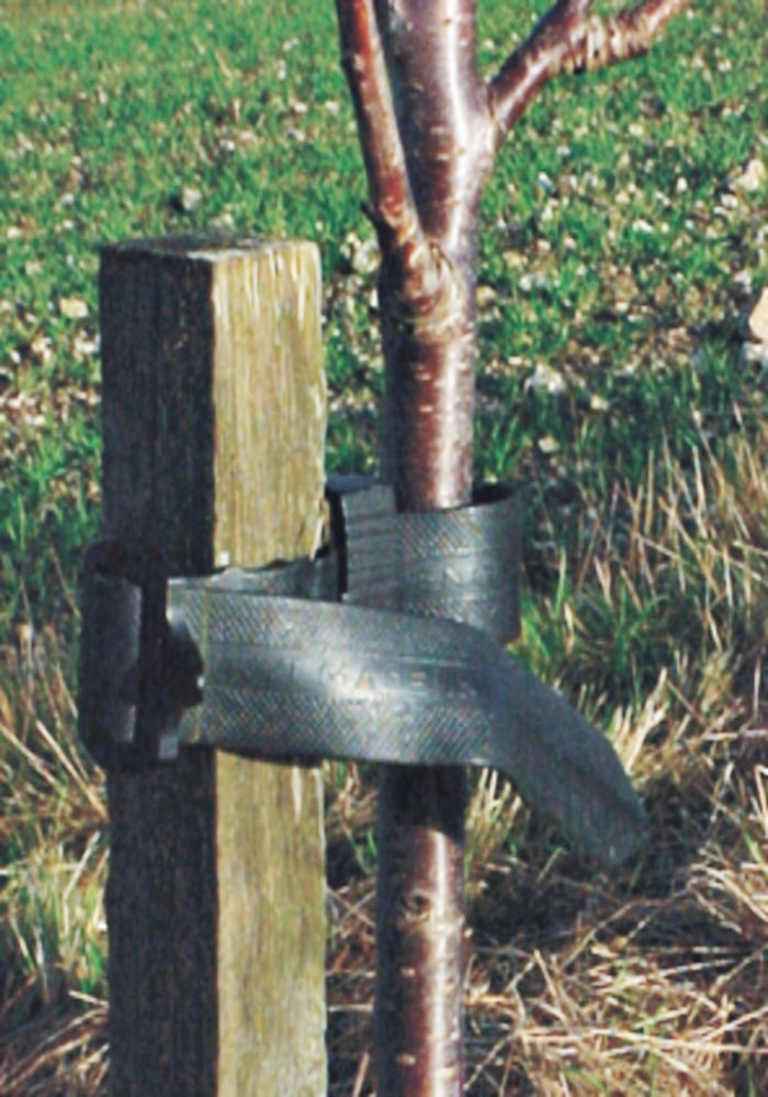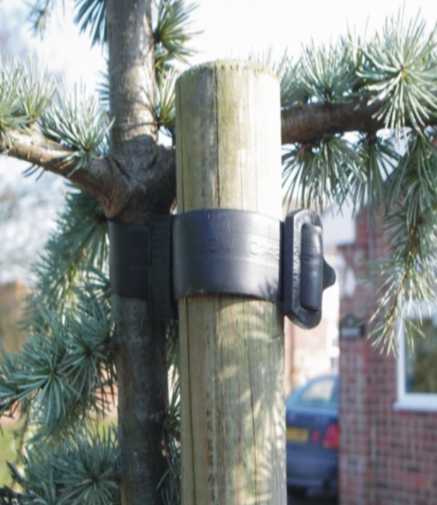 Każdy komplet zawiera gumową klamrę: zapobiega ona ocieraniu się drzewa o palik - tworzy odstęp pomiędzy palikiem a drzewem